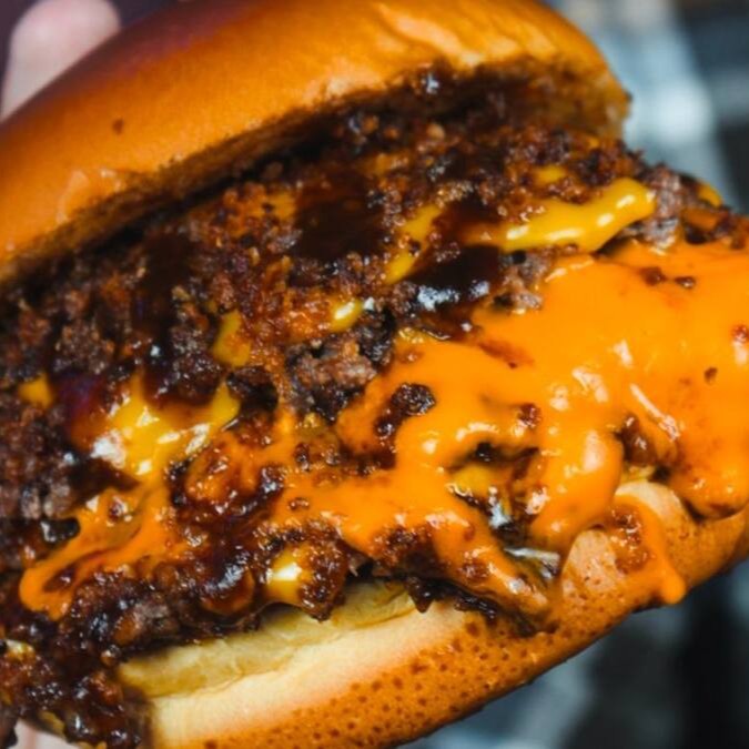 Pão brioche amanteigado, Três Smash Burger de 90, com Aquele mix de queijo Cheddar, com Farofa de bacon, E Molho Bbq