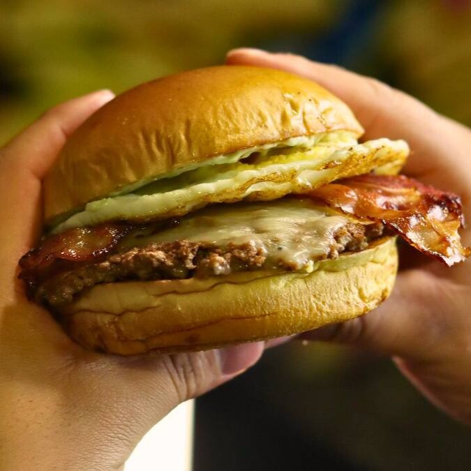 Pão amanteigado, dois hambúrguer de 90g, Queijo Mussarela, bacon em fatias, ovo e maionese verde da casa.