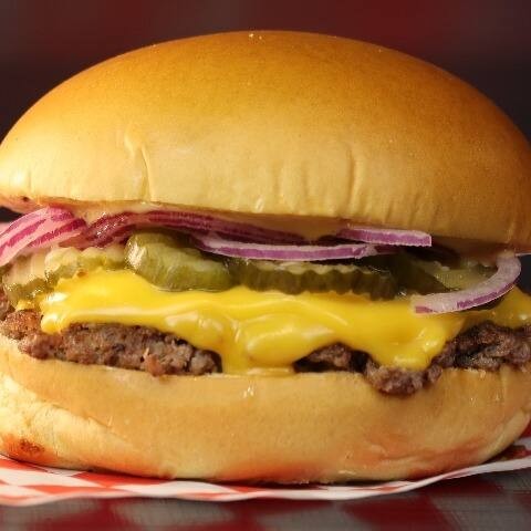 Pão amanteigado, com hambúrguer de 90g, Queijo cheddar, Cebola, Picles, molho Rosé.
