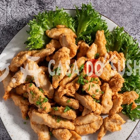 Deliciosas fatias de salmão crocante são combinadas com uma camada irresistível de crocância, criando uma experiência única.