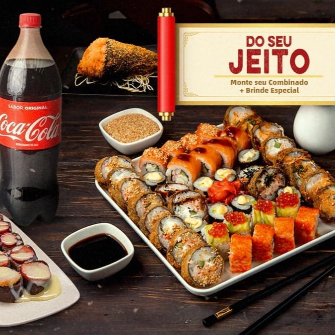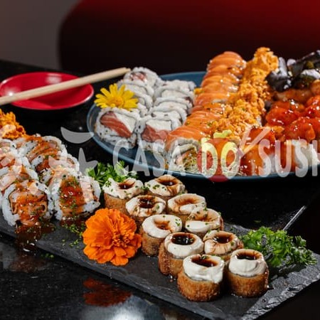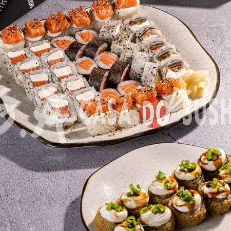 20 Uramaki Filadélfia 20 Uramaki Kani 10 uramaki skin Especial com cream cheese e Doritos 10 uramaki skin Especial encapado com salmão e molho de maracujá 10 Hossomaki de Salmão 10 Batera de Salmão 20 Hot Filadélfia