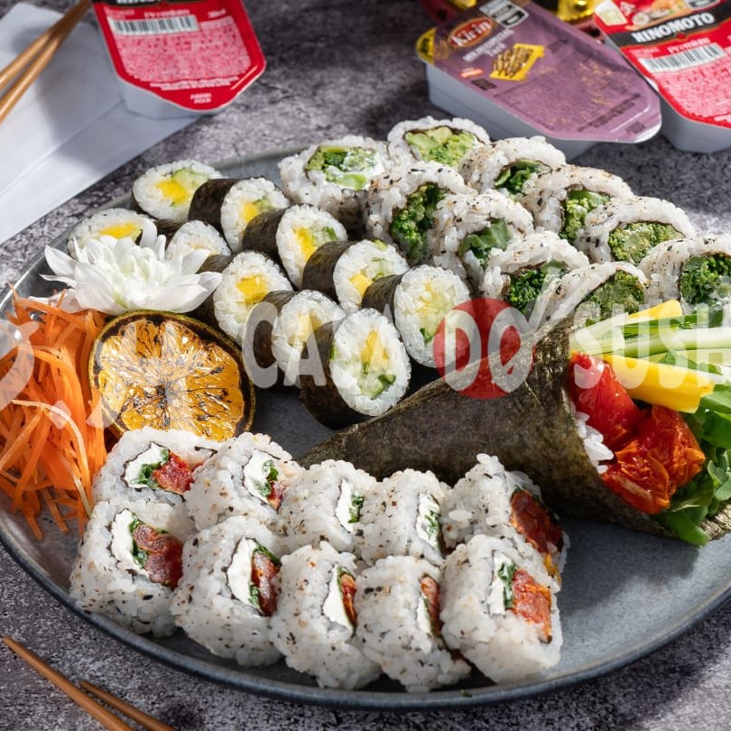 10 uramaki tomate seco com rúcula 10 hossomaki de pepino e manga 10 uramaki brocolis e couve flor 1 temaki de tomate seco,rúcula, pepino e manga