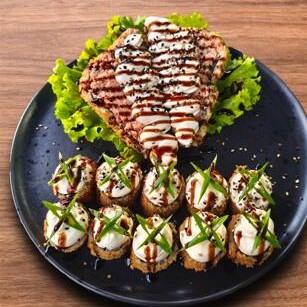 Arroz Japonês Empanado E Crocante, Recheado Com Salmão Grelhado, Cream Cheese E Couve Crispy. Uma Opção Mais Intensa, Com Sabor Defumado E Textura Irresistível.