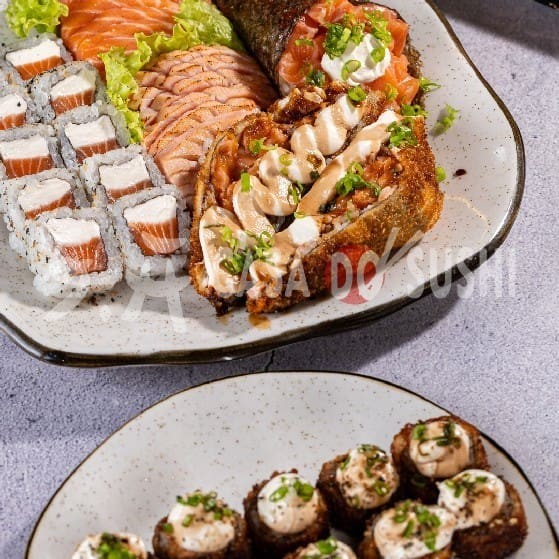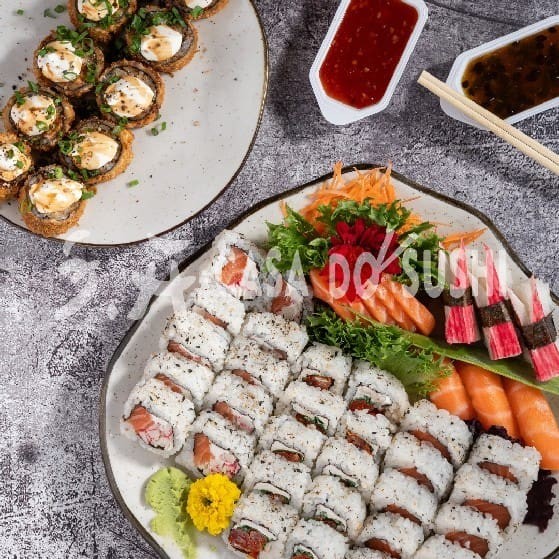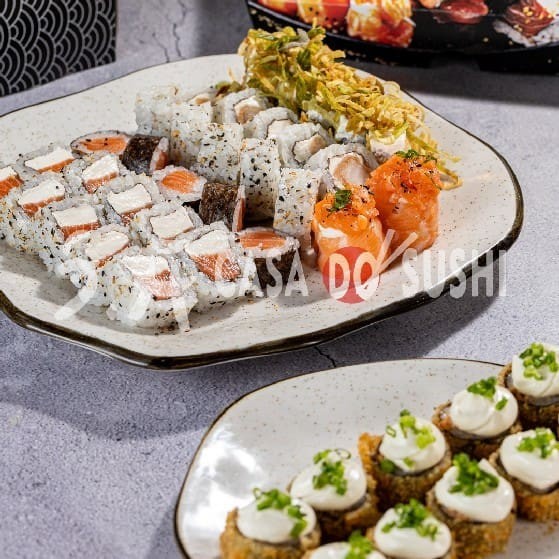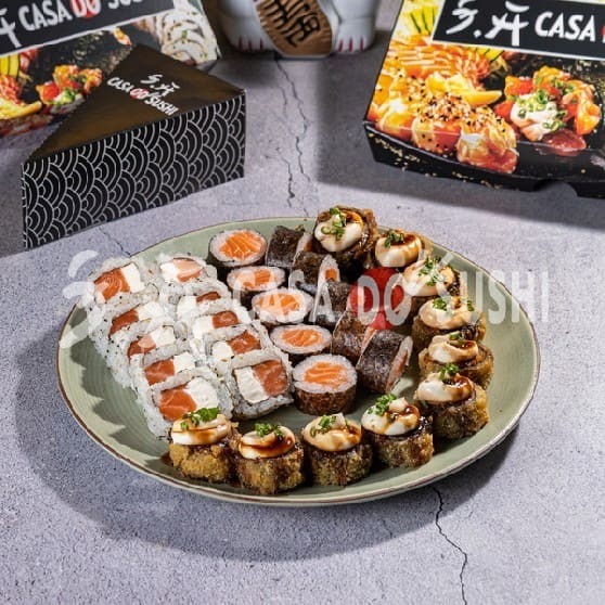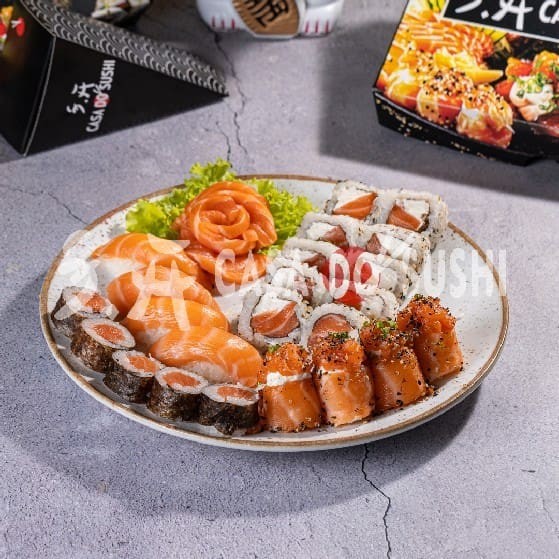 20 Uramaki Filadélfia + 10 Hossomaki de Salmão + 10 Uramaki Especial (Cream Cheese e Molho Maracujá) + 10 Uramaki encapado de salmão com Doritos + 20 Hot Filadélfia + 10 Uramaki Kani