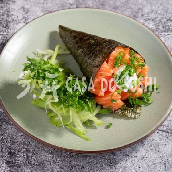 O Temaki Filadélfia Sem Arroz É Uma Delícia Envolta Em Alga Crocante, Recheada Com Salmão Fresco, Cream Cheese Cremoso E Aguacate. Leve E Irresistível, Ele Combina Sabores Delicados E Uma Textura Surpreendente Em Cada Mordida