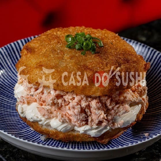 Com Suculento Salmão Fresco, Levemente Temperado E Moldado Em Formato De Hambúrguer De Arroz, É Coberto Com Uma Camada De Cream Cheese E Um Toque De Molho Especial.