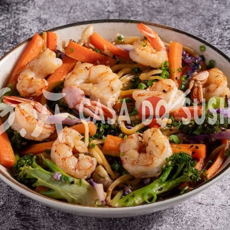 Desfrute de 500g de yakisoba, com camarões suculentos, legumes frescos e um molho delicadamente temperado.