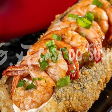 Com camarões suculentos e levemente temperados, combinados com arroz de sushi moldado em formato de hambúrguer, e cobertos com molho teriyaki e maionese, é uma explosão de frescor e cremosidade em cada mordida.