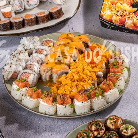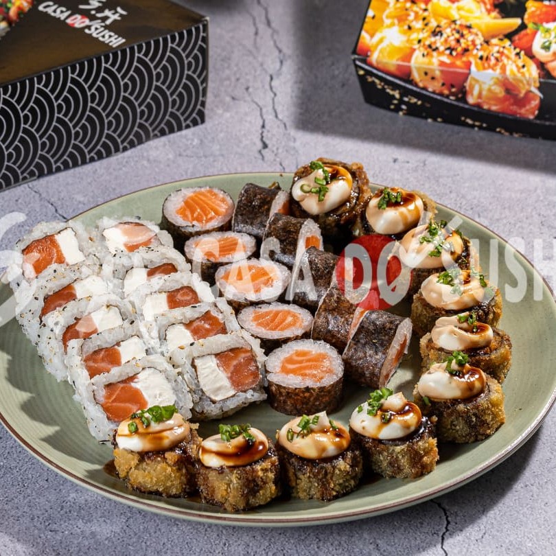 20 Uramaki Filadélfia 20 Uramaki Kani 10 uramaki skin Especial com creamcheese e Doritos 10 uramaki skin Especial encapado com salmão e molho demaracujá 10 Hossomaki de Salmão 10 Batera de Salmão 20 Hot Filadélfia