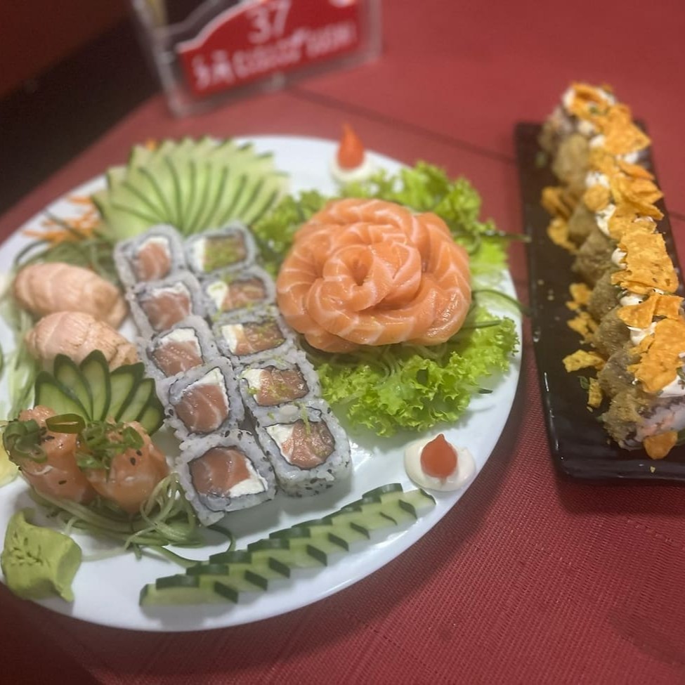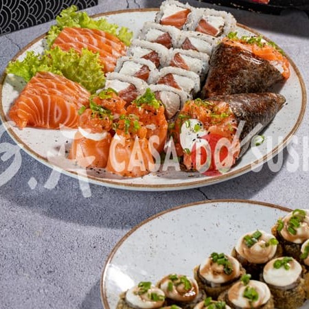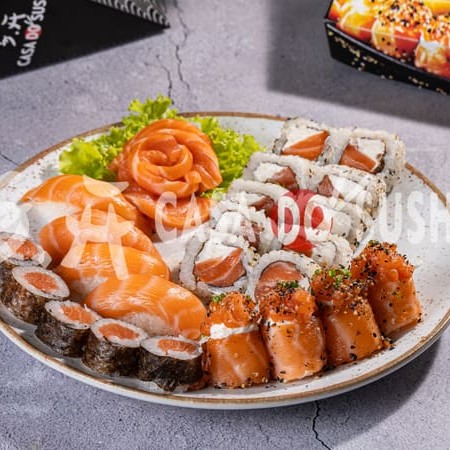 10 uramaki filadélfia 5 sashimi de salmão 5 sashimi de salmão maçaricado 5 hossomaki de salmão 4 niguiri de salmão 4 joe de salmão