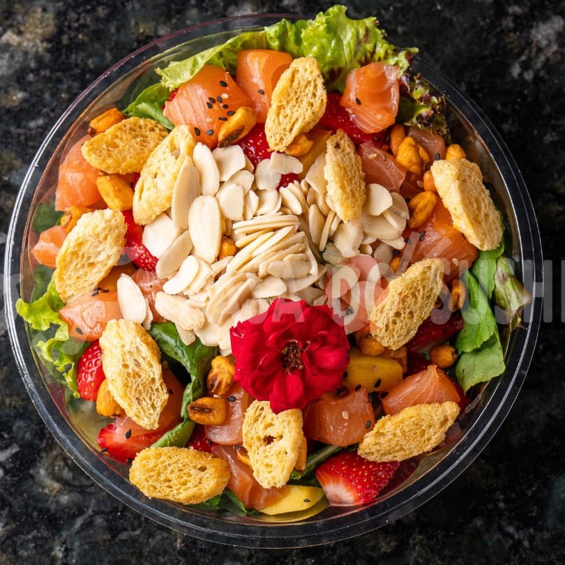 Mix de folhas: Manga: Morango: Salmão em cubos: Torradinhas: Molho: