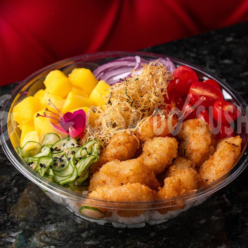 Camarão crocante: Cebola roxa: Sunomono: Manga: Tomate cereja: Chips de batata doce: Arroz: Laminas de amêndoas:
