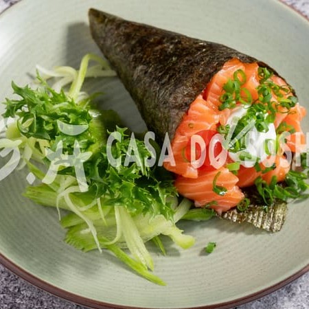 Recheado com pele de salmão crocante e chinesa, complementado por cream cheese e um toque de cebolinhas frescas, envolto em alga nori crocante.