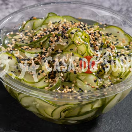 Pepinos crocantes em um molho agridoce, com um toque de gergelim e algas. Ideal como acompanhamento leve e saboroso.
