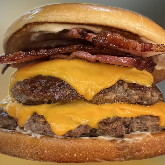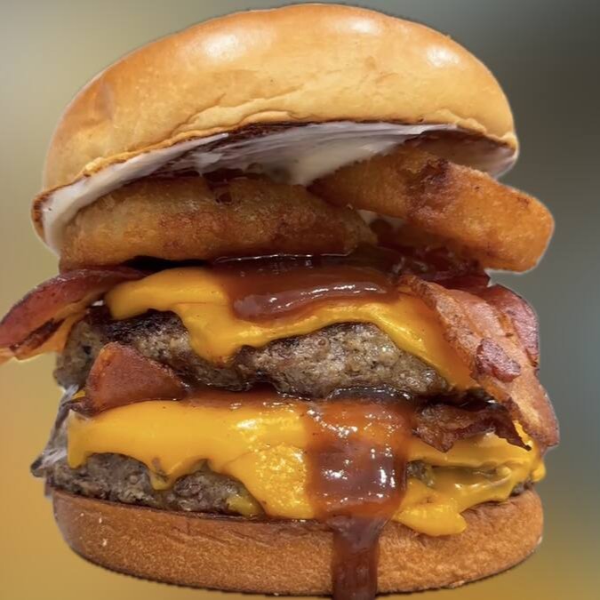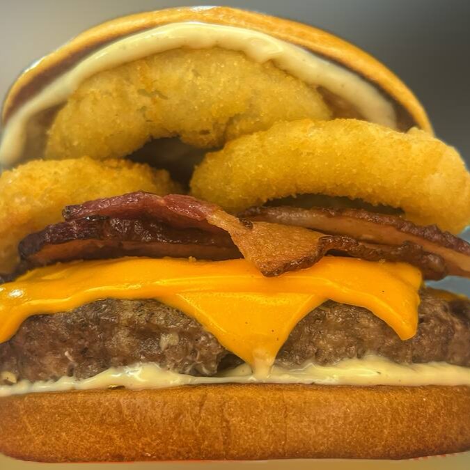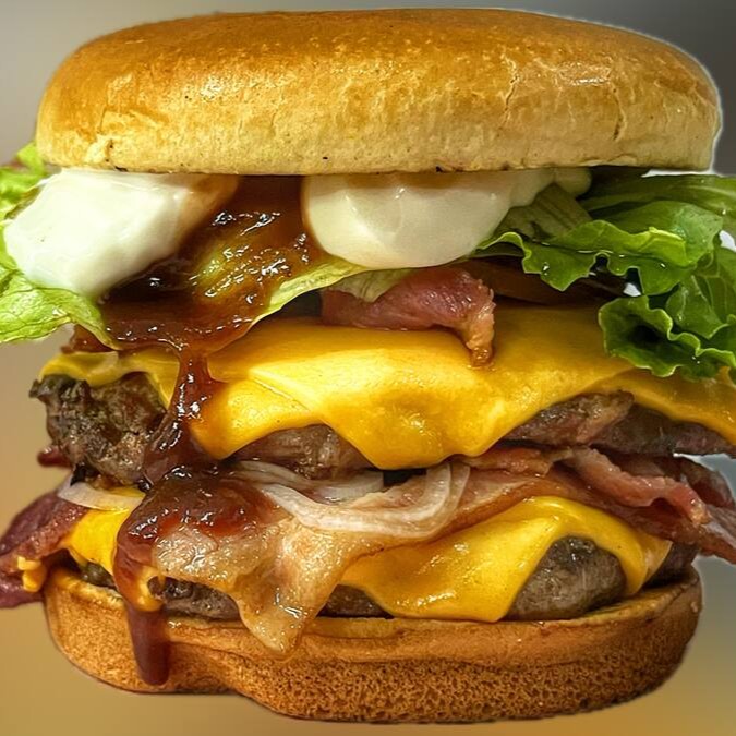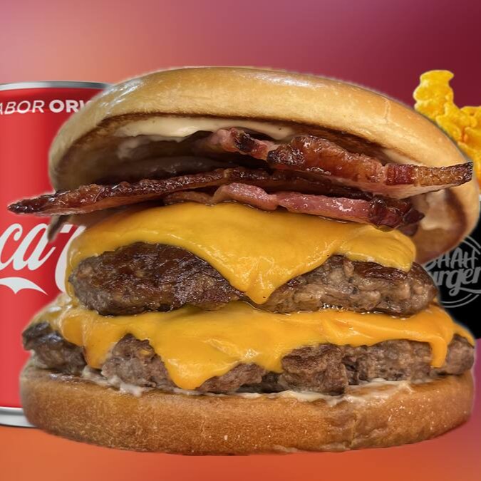 O burger que desafia sua fome! 2 carnes de 150g cada, é complementada por dupla generosa camada de queijo cheddar derretido, que acrescenta uma cremosidade irresistível. Juntamos a isso o bacon crocante, que oferece uma textura única e um toque perfeito, e anéis de cebola empanados, proporcionando um contraste deliciosamente crocante. Finalizamos com nossa exclusiva maionese, que adiciona um toque suave e um sabor inigualável que fará seus sentidos dançarem. Um burger que promete satisfazer até os apetites mais vorazes!