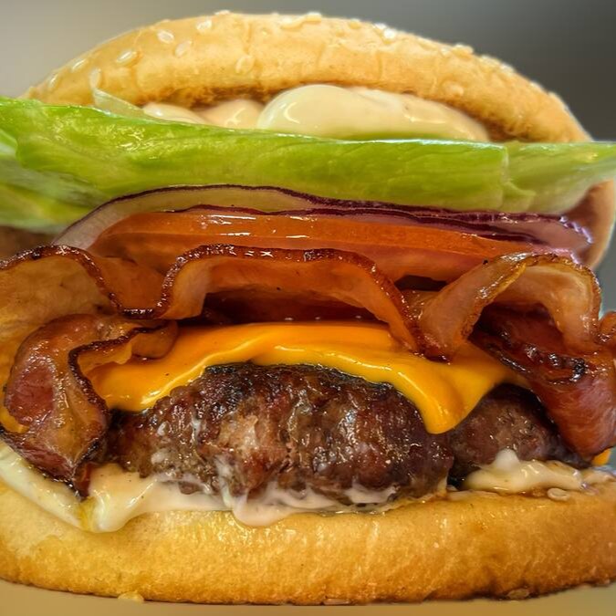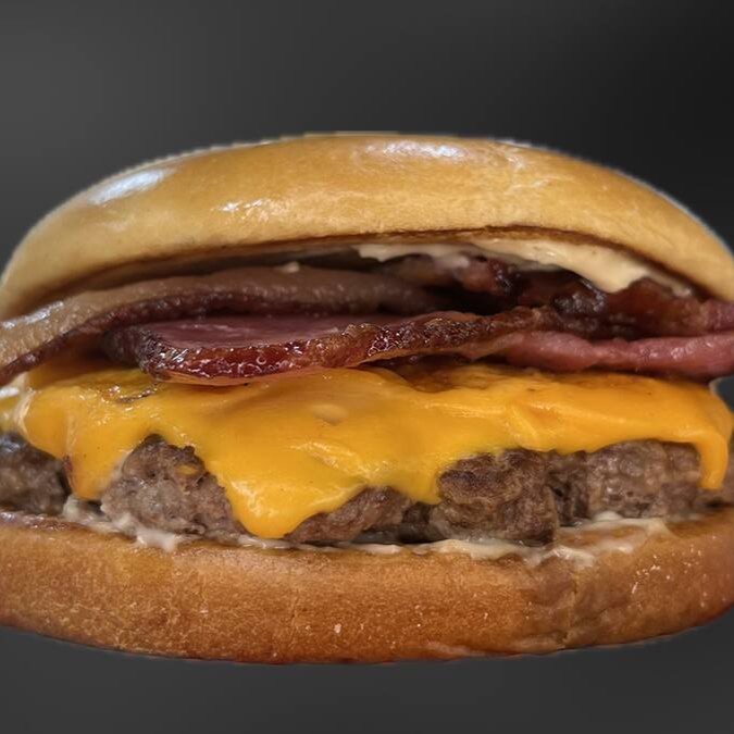 Pão brioche smash de 80g, queijo cheddar fatias, bacon em tiras, barbecue e maionese.