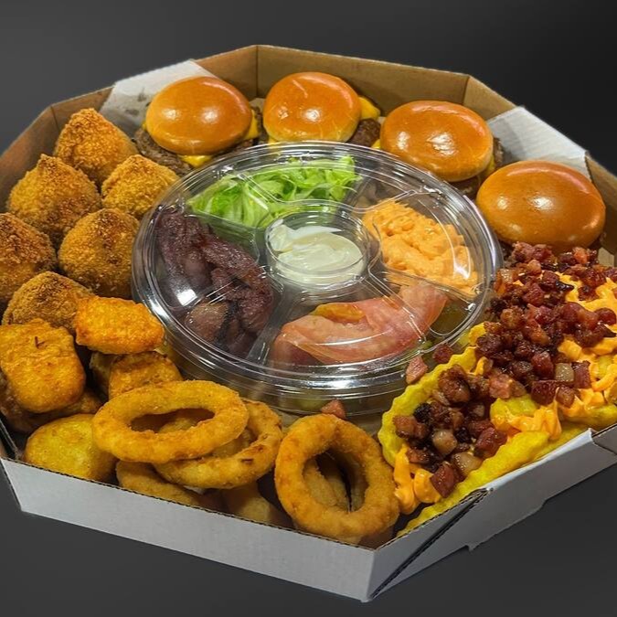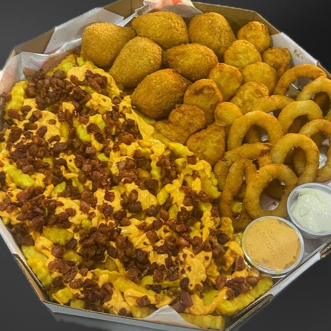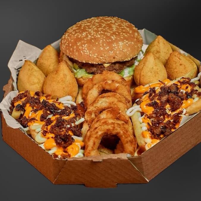 4 acompanhamentos, fritas com cheddar bacon, 6 coxinhas, 10 onion rings e 10 chicken supreme + 2 molhos da casa. (não é possível remover ou trocar itens)