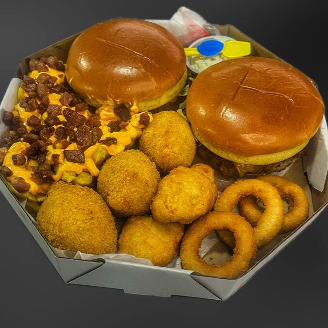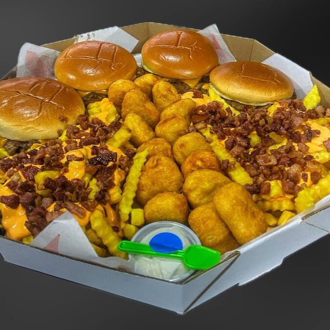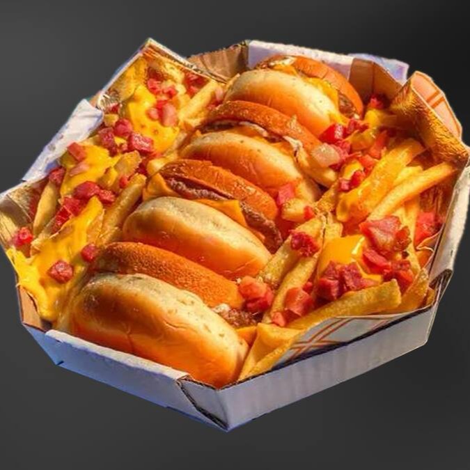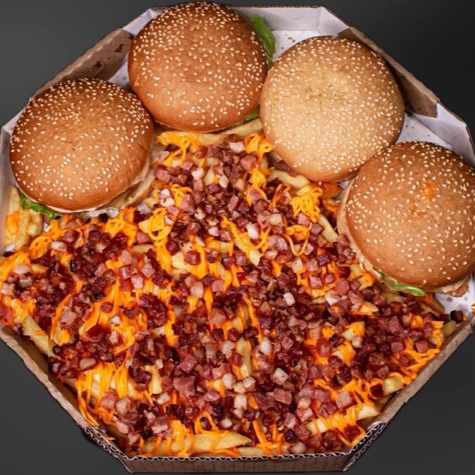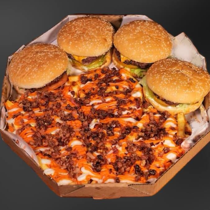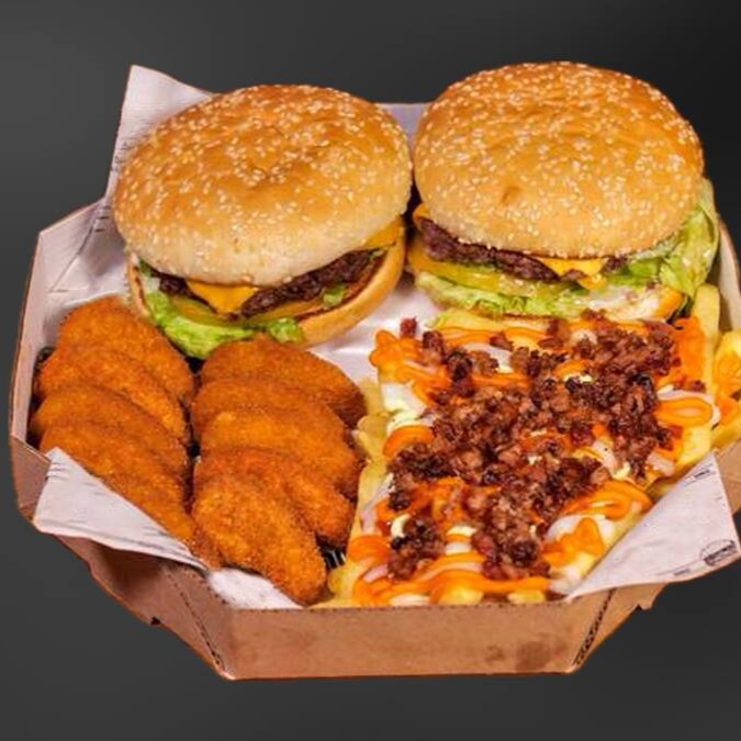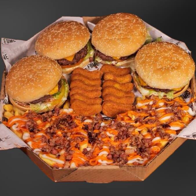 4 burguinho artesanal angus de 70g, queijo cheddar fatias, no pão brioche, petisqueira com alface, bacon, tomate, picles, cheddar cremoso, maionese branca defumada da casa. Porção de fritas cheddar e bacon, 6 anéis de cebola, 6 nuggets supreme,
