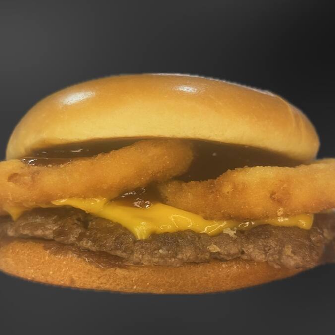 Pão brioche, Smash de 80g, Queijo Cheddar fatias, 3 Aneis de cebola frito(dentro do burger), molho barbecue, maionese.