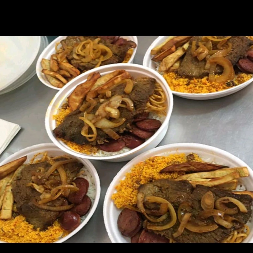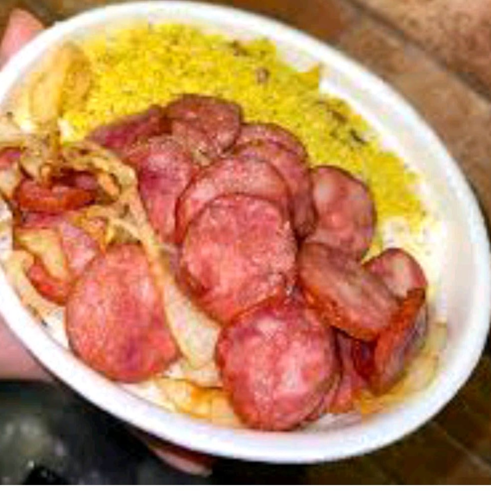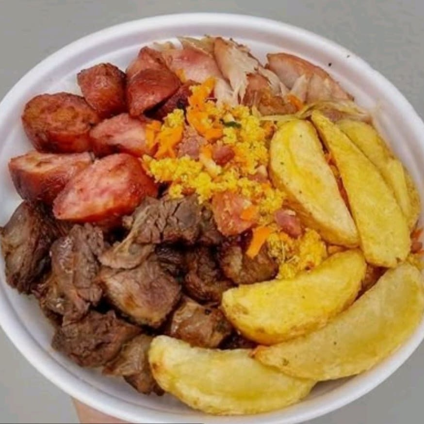 Arroz, feijão, macarrão, farofa, bovina, linguiça ou frango, suína.