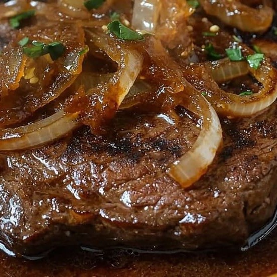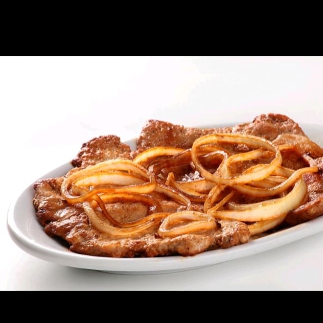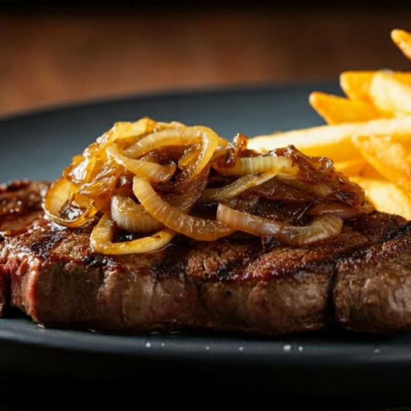 Bife macio e suculento, coberto com cebolas douradas na manteiga. Um clássico cheio de sabor e tradição!