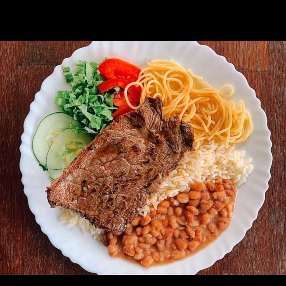 Bife , ovo , arroz , feijão , farofa , macarrão, e batata frita.