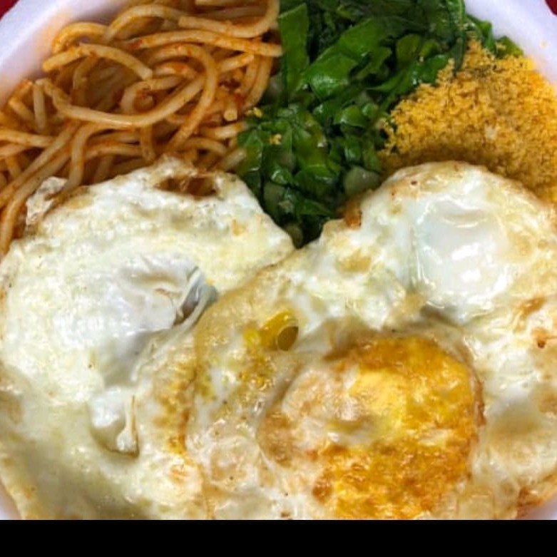 Arroz feijão macarrão, legumes,farofa. e 2 ovos cada marmitas.