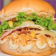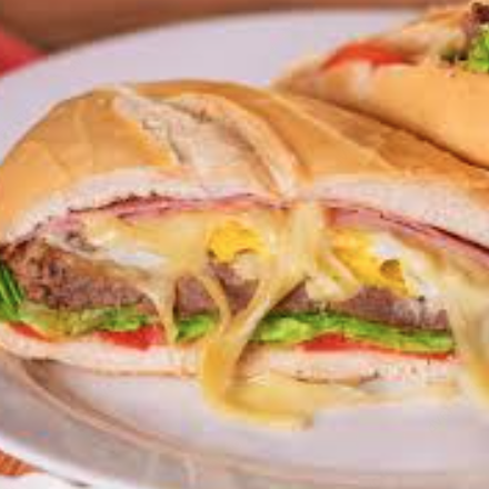 Pão, hambúrguer, ovo, salada, milho, bacon, calabresa, frango, presunto, queijo, maionese artesanal e orégano.