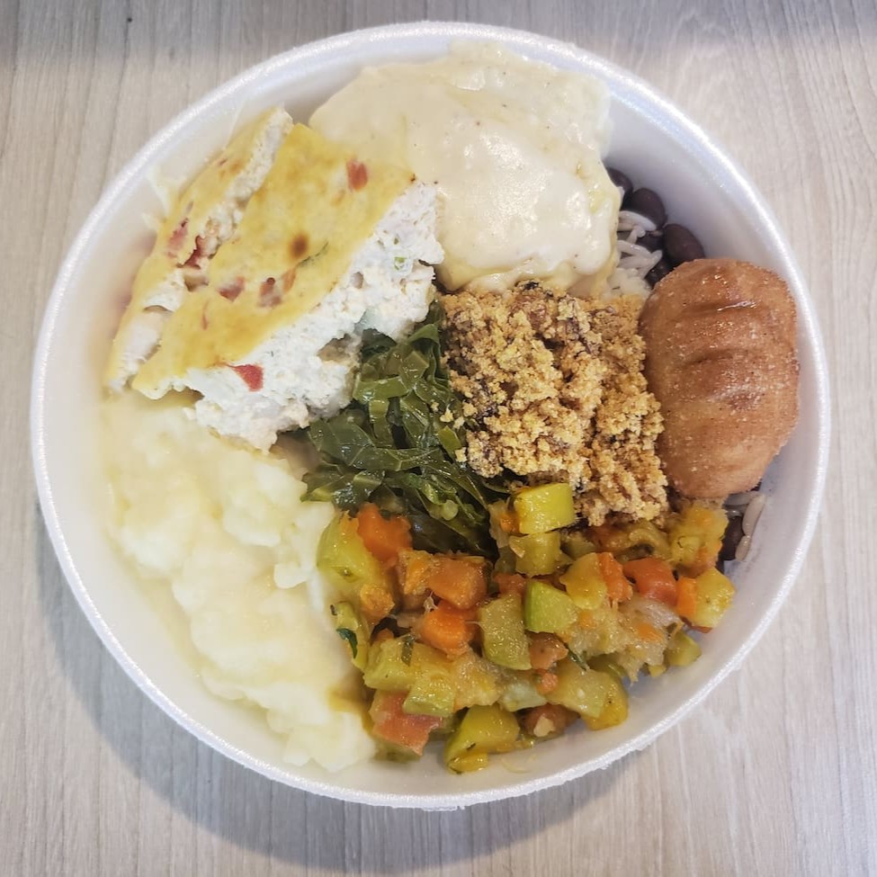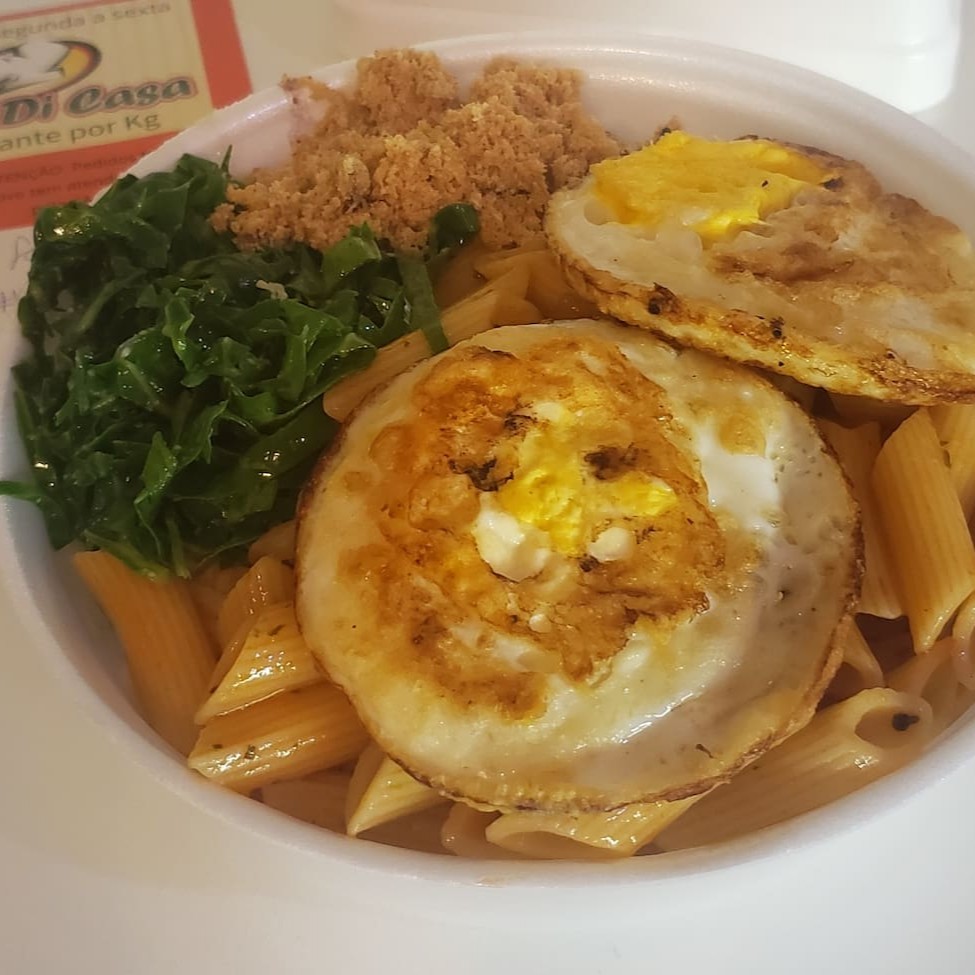 Arroz, feijão, legumes do Dia, macarrão do Dia, farofa especial e 2 ovos