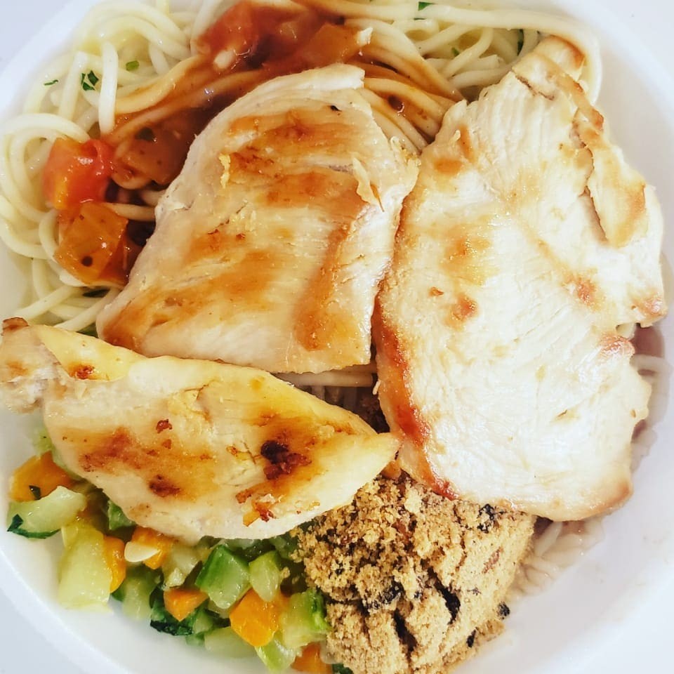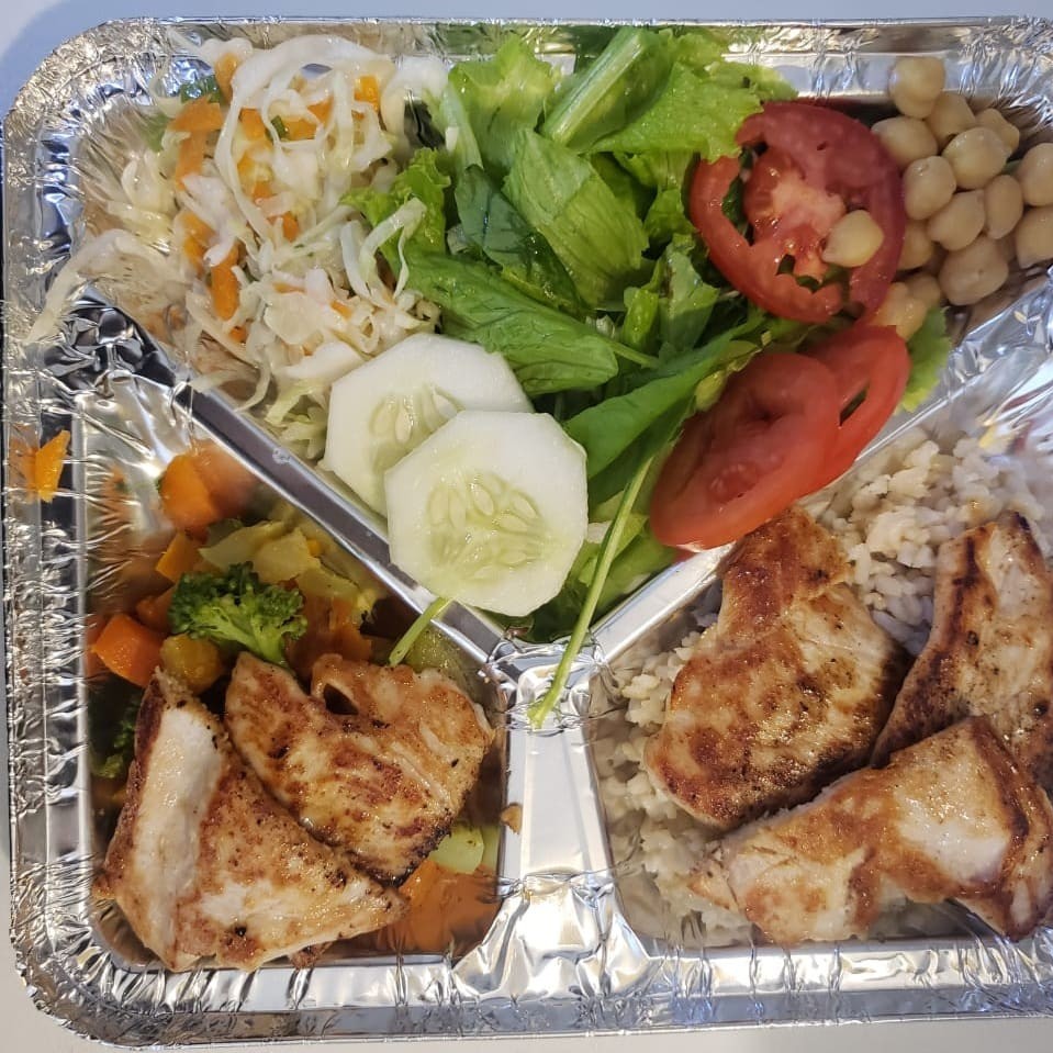 Mix de salada, arroz integral, feijão, legumes do Dia e frango grelhado