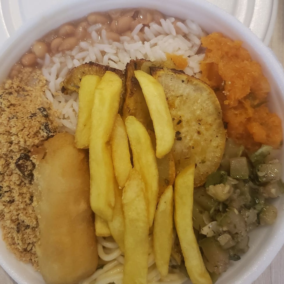 Arroz, Feijão, Legumes Do Dia, Farofa Vegana, Banana Frita E Opções Vegetarianas Do Dia (PROTEÍNA DE SOJA). Atenção Escolha O Tamanho! Itens Adicionais Disponiveis!