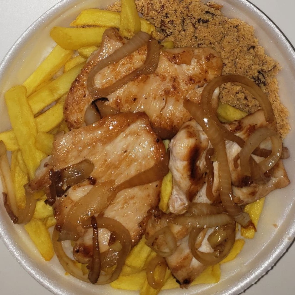 Arroz, feijão, batata frita, farofa especial e frango grelhado Atenção Escolha O Tamanho! Itens Extras Também Estão Disponiveis!