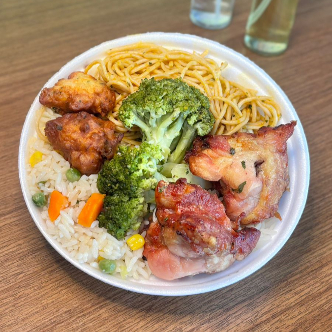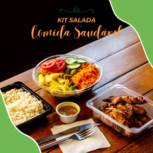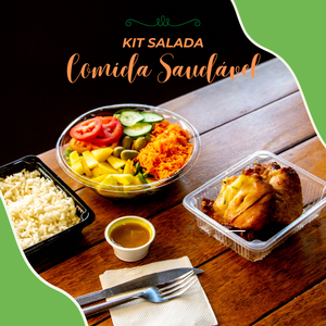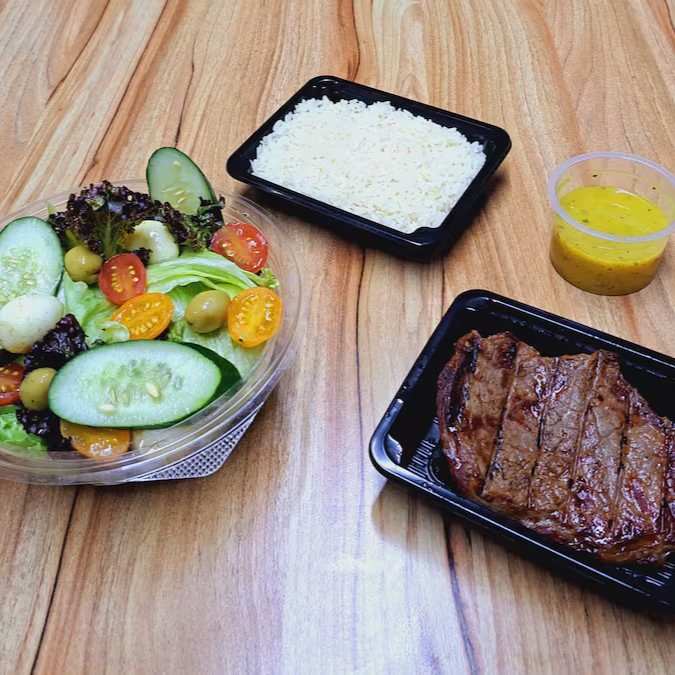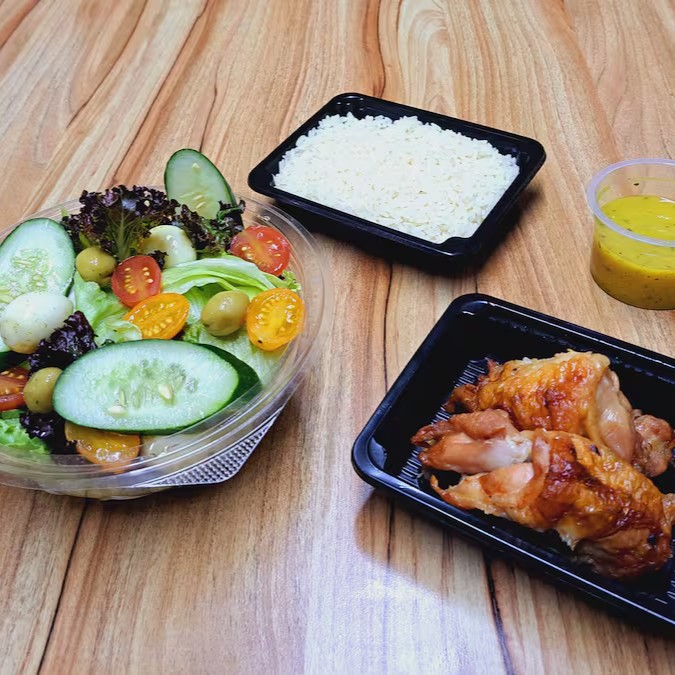 Acompanhado de arroz , mix de folhas verdes, tomate, pepino, cenoura ralada, manga, azeitonas e molho da casa(mostarde e mel)