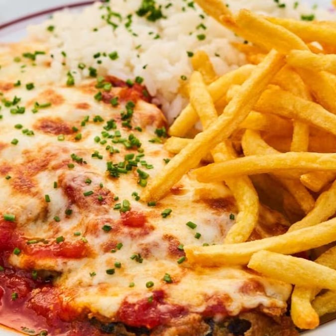 Bife à parmegiana mergulhado em molho vermelho encorpado, coberto por um manto de queijo derretido que se estica como promessa de prazer