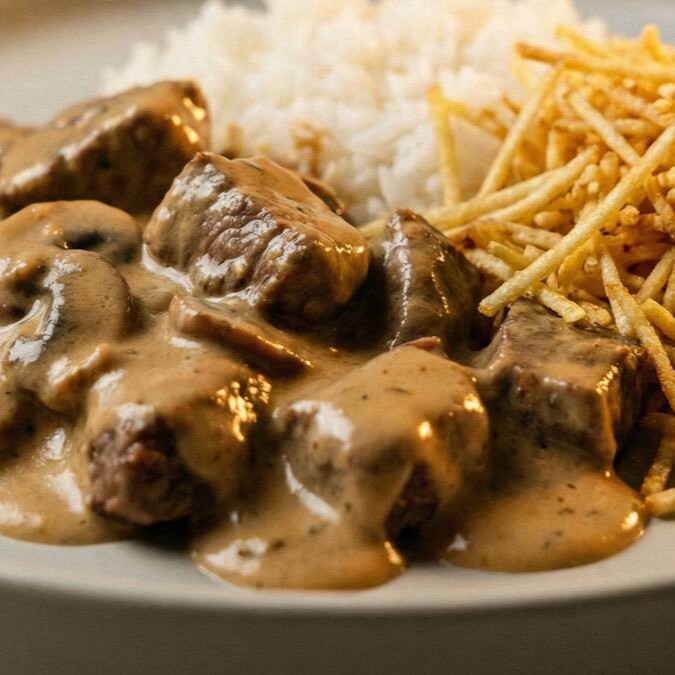 Strogonoff de carne cremoso (120g), preparado com molho encorpado e sabor marcante, acompanhado de arroz branco soltinho (100g) e batata palha. Uma combinação tradicional que agrada em qualquer refeição.