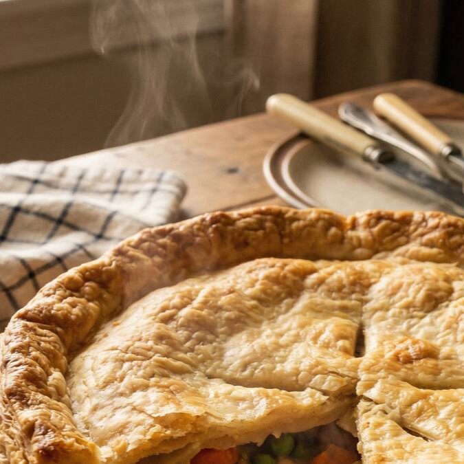 Empadão de frango com massa dourada e recheio farto, preparado com ingredientes selecionados. Ideal para compartilhar ou para uma refeição completa.