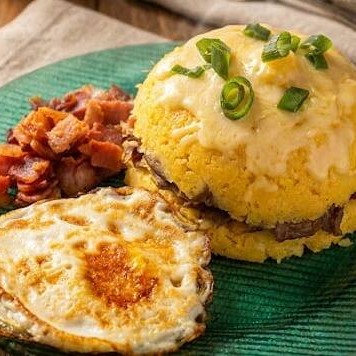 Cuscuz flocado super hidratado,recheado com carne seca desfiada e coberto com queijo muçarela derretida e cebolinha fresca.Acompanha um ovo frito perfeito e bacon em cubos crocantes.O equilibrio ideal entre sustãncia e sabor