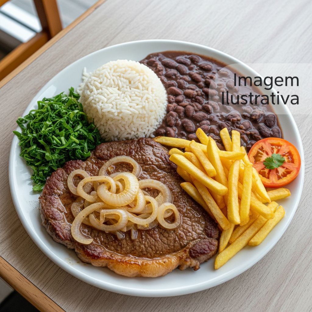 Bife acebolado servido com arroz, feijão,batata frita e spaguet