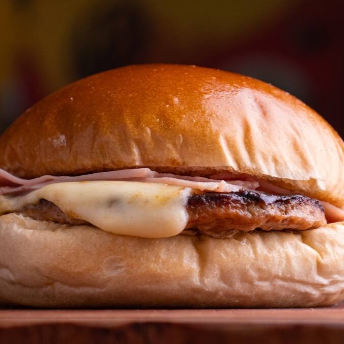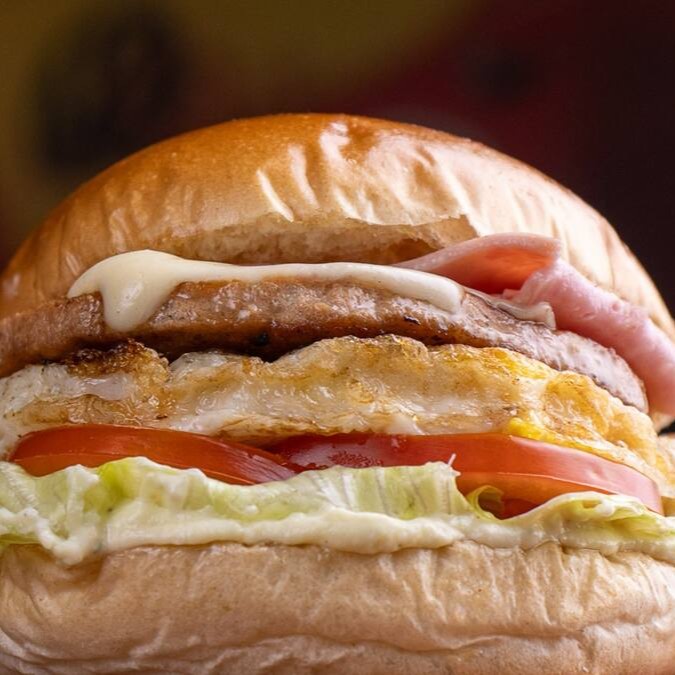 Pão brioche selado na chapa, hambúrguer 56gr industrializado, Ovo, queijo mussarela, maionese da casa, tomate e alface