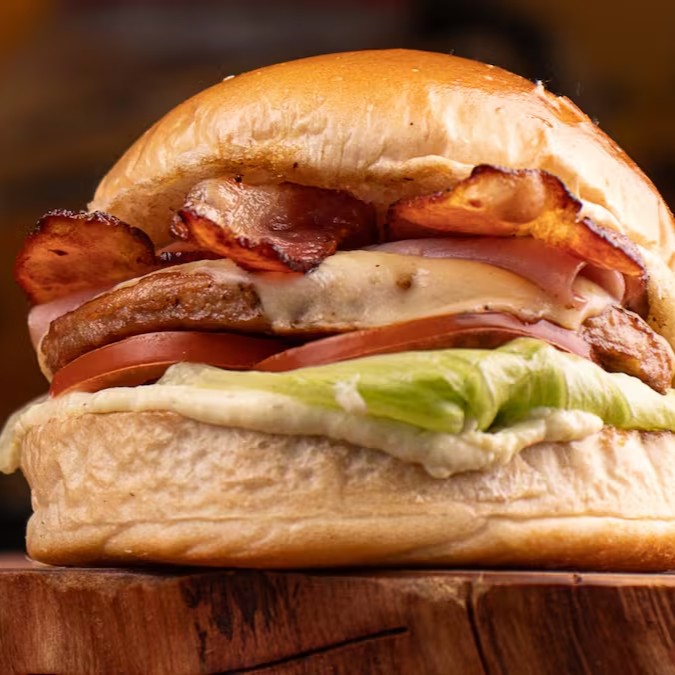 pão chapeado, 2 hamburgueres de 56 g (ind), bacon e tiras, alface, tomate, ovo frito , catupiry