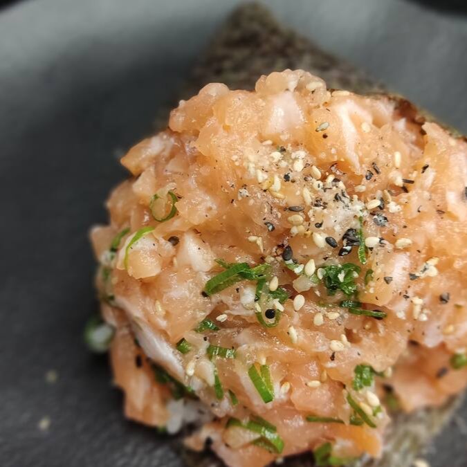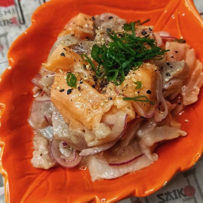 Salmão,peixe branco,marinados no limão e laranja. Azeite de oliva ,cebola roxa, pimenta sriracha e cebolinha. 240g