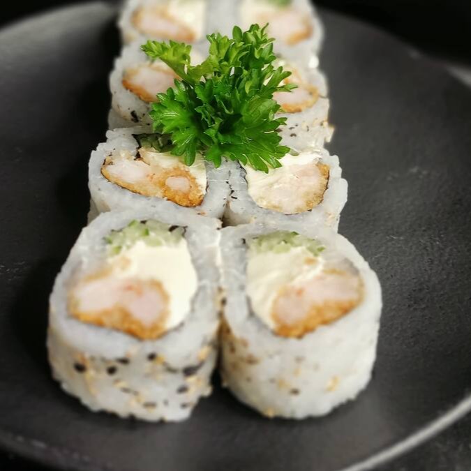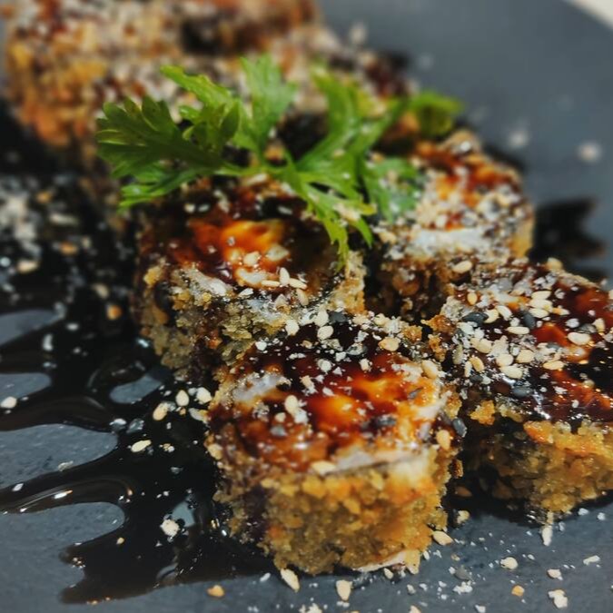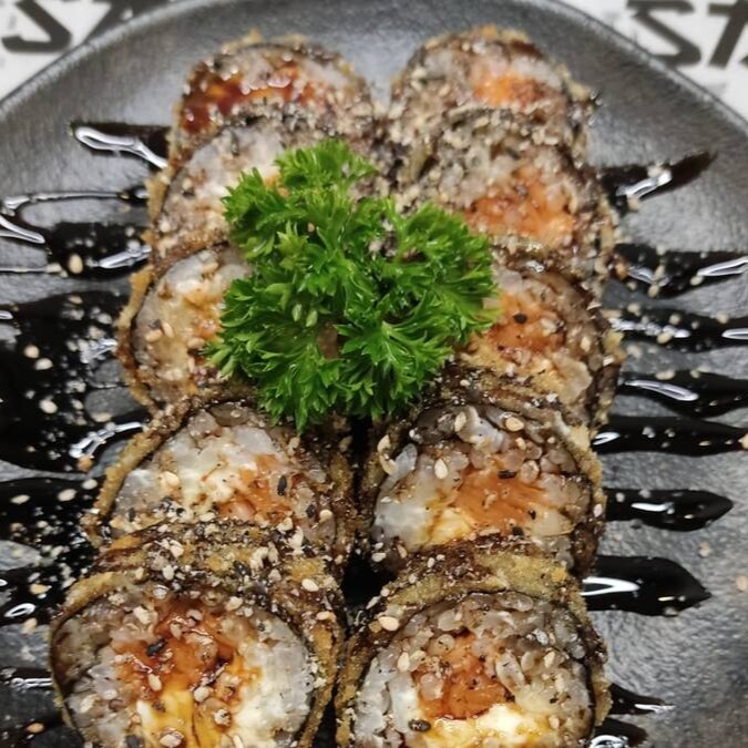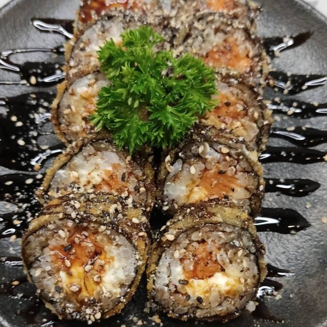 Nori, Arroz Japonês, Salmão, Cream Cheese, Empanado Na Panko, E Com Molho Tarê