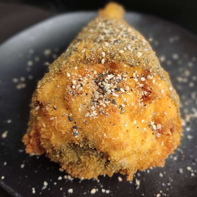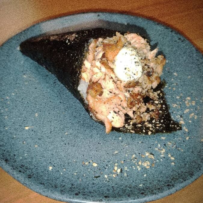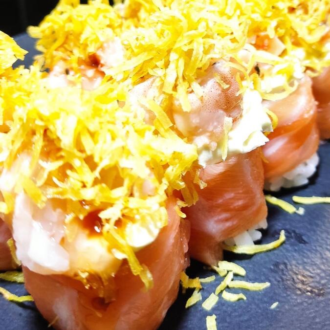 Sushi Em Forma De Cone Recheado Com Arroz Japonês,Salmão,Cream Cheese, Empanado E Frito Finalizado Com Gergelim .Acompanha Molho Tarê.