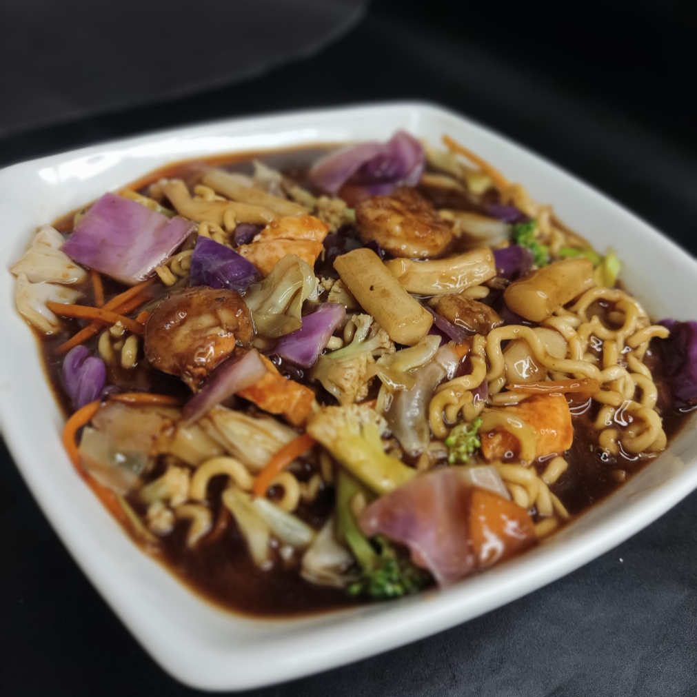 MACARRÃO ORIENTAL, CARNE, BRÓCOLIS, COUVE-FLOR, REPOLHO VERDE, REPOLHO ROXO, CENOURA, SALTEADO NA CHAPA E UM TOQUE DO MOLHO ESPECIAL DO CHEFE