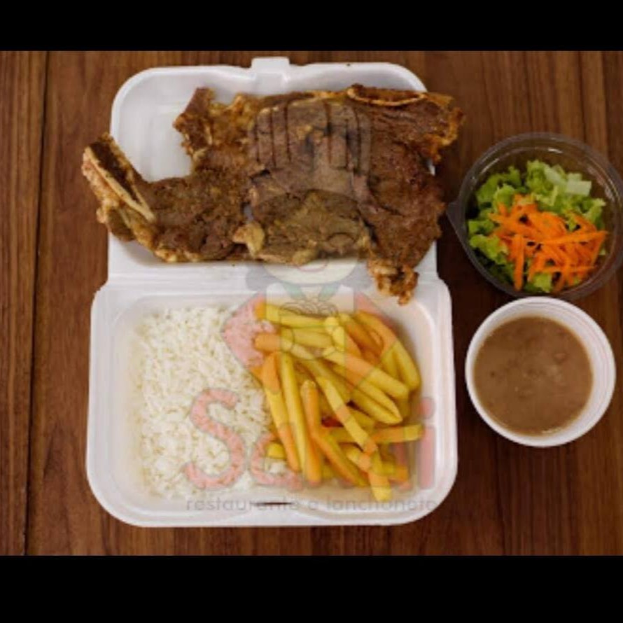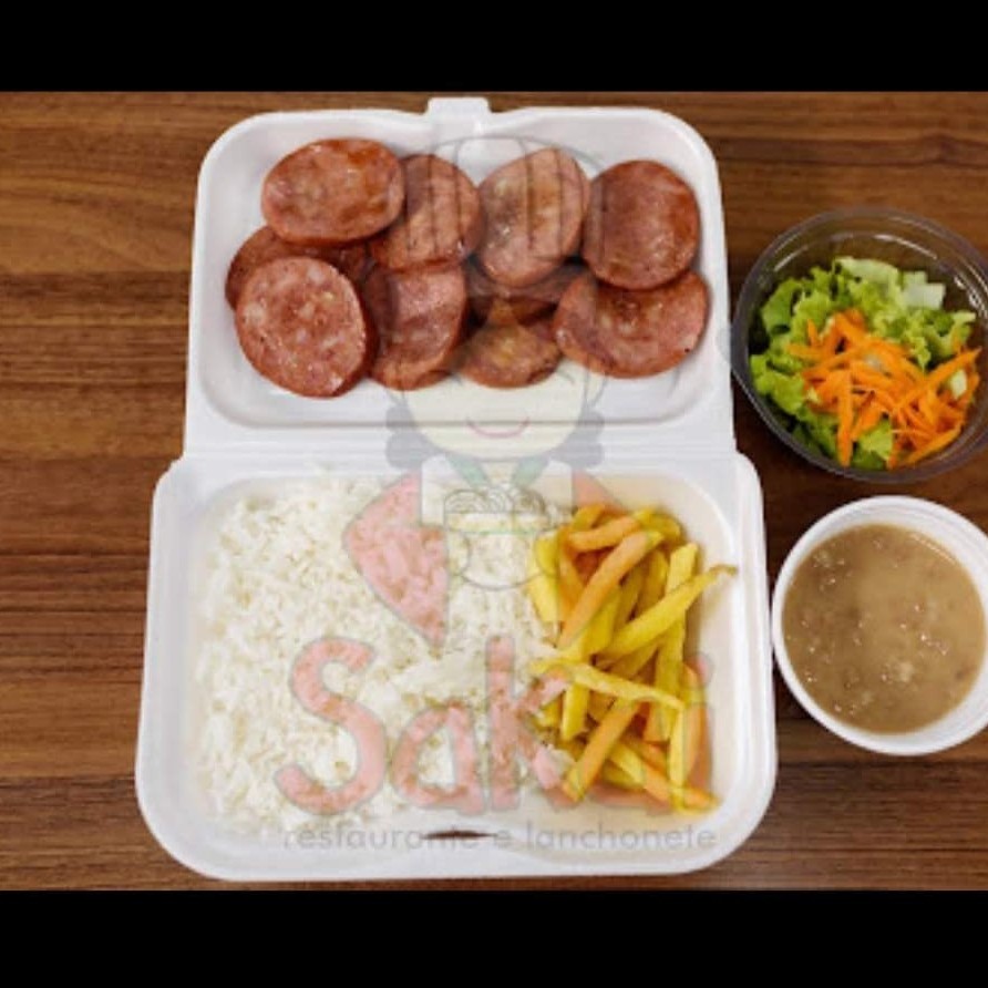 Arroz, feijão carioca ou Feijão Preto, batata frita, salada e calabresa