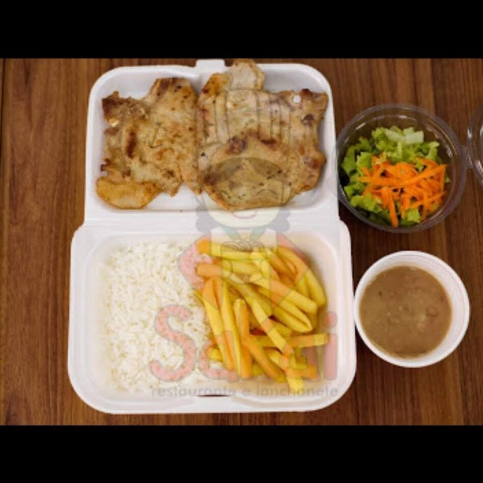 Arroz, feijão preto ou Feijão carioca, batata frita, salada e bisteca de porco
