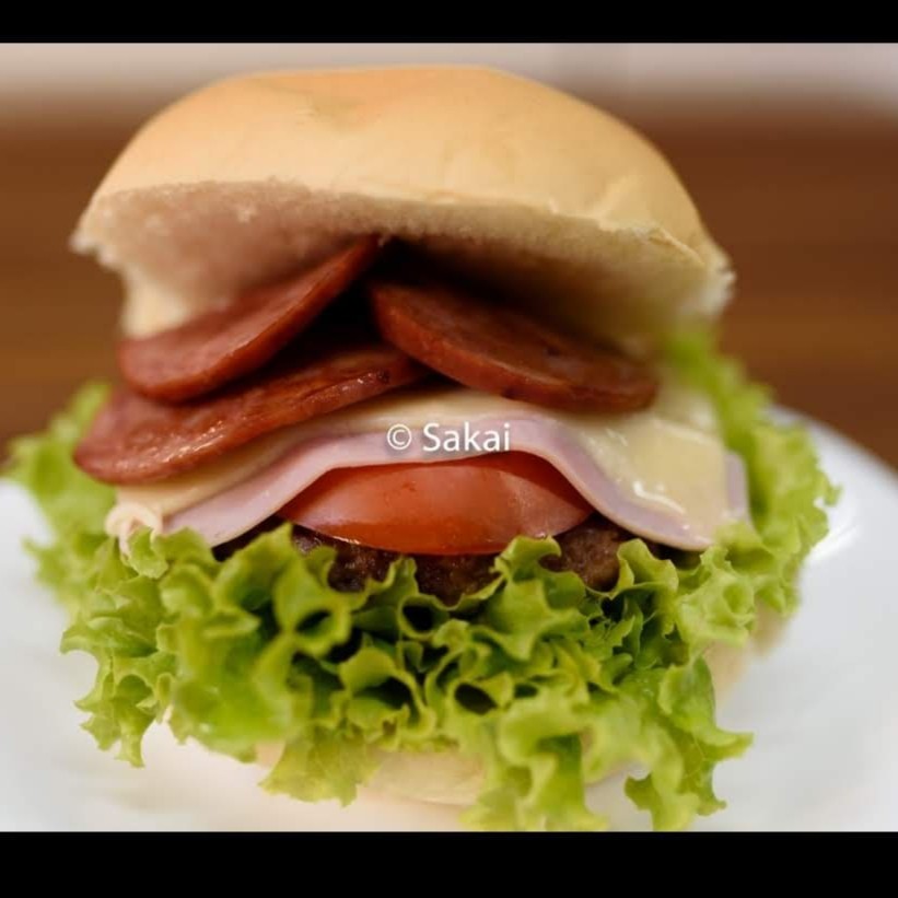 Pão, alface e tomate, hambúrguer caseiro 120 gramas, rodelas de calabresa, queijo, presunto.