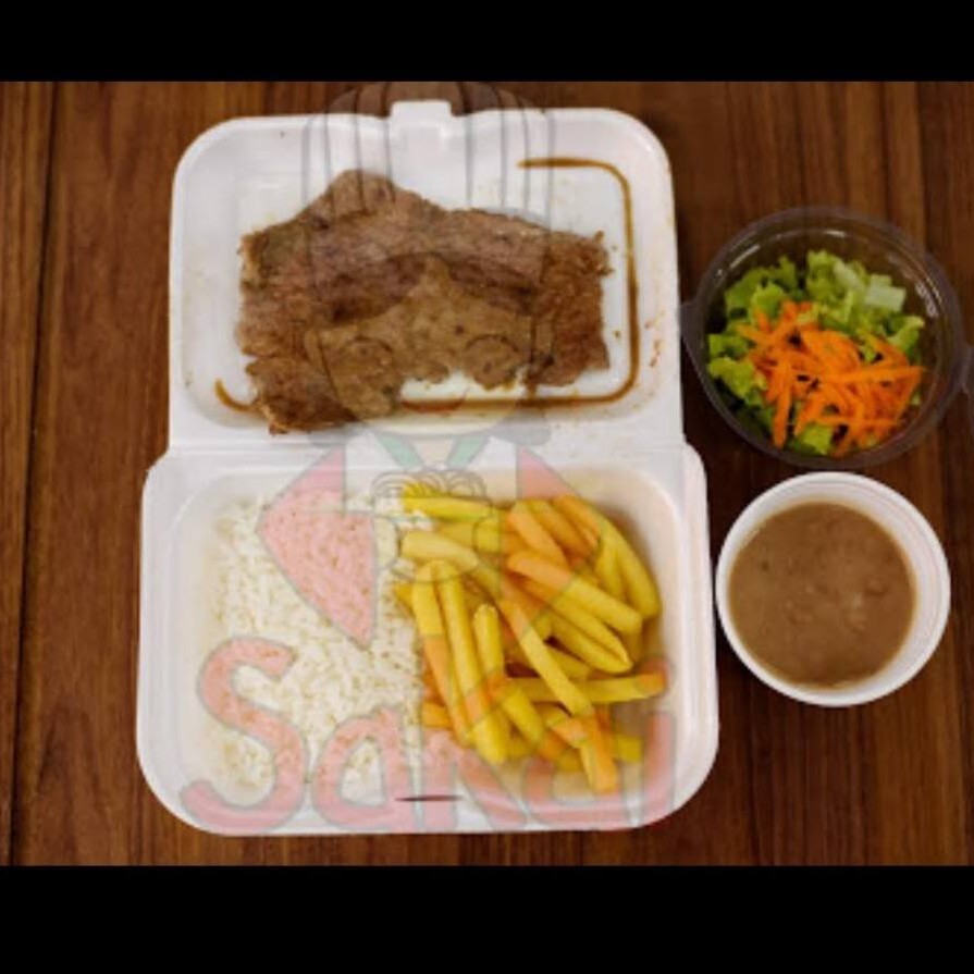 Arroz , feijão preto ou feijão carioca, batata frita, salada e Bife coxão mole