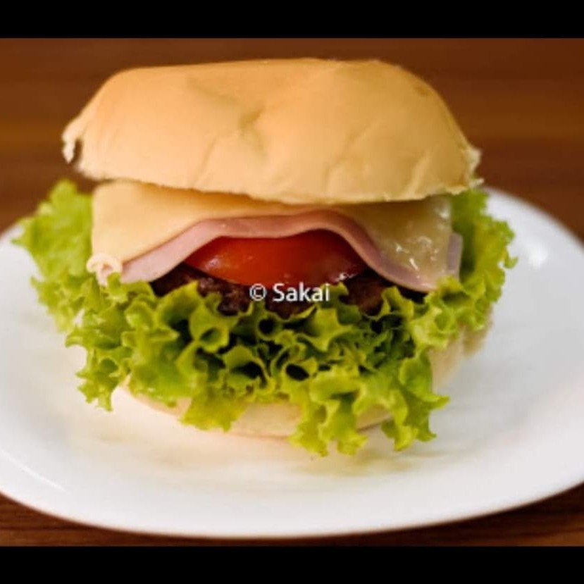 Pão, hambúrguer caseiro 120 gramas, queijo, presunto.