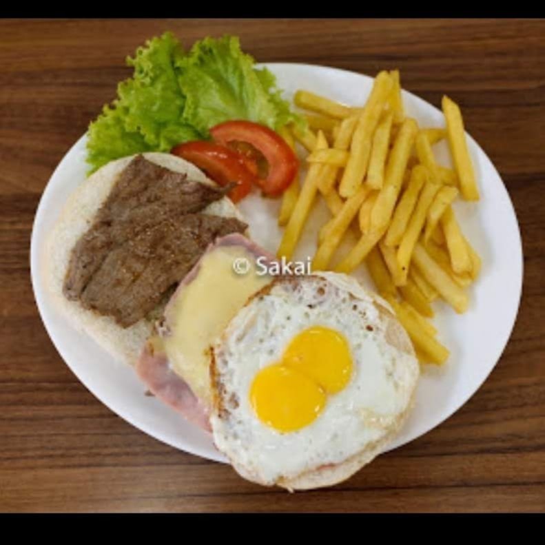 Pão, queijo, presunto, ovo frito , batata frita. Opções de carnes de Bife ou frango.